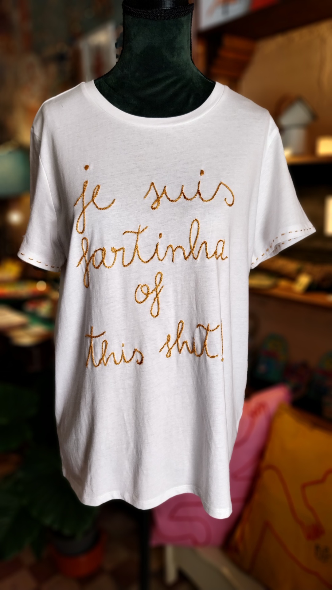 Home T-Shirts Bordadas à mão JE SUIS FARTINHA OF THIS SHIT bordado grande JE SUIS FARTINHA OF THIS SHIT bordado grande Tamanho S M L XL Cor da t-shirt Branco Preto Cor da linha para bordar Escolha uma opção Preto Branco Vermelho Azul escuro Azul Claro Amarelo Verde Roxo Rosa Cinzento 45,00 € Desconto de %. Comprar Contactar A T-shirt ideal para vestires nos dias é que já não aguentas mais merdas ! T-SHIRTS BORDADAS À MÃO POR ENCOMENDA !!São produtos bordados à mão e levam tempo a Bordar . Se tens uma data limite coloca nas observações da encomenda essa data :) Partilhar