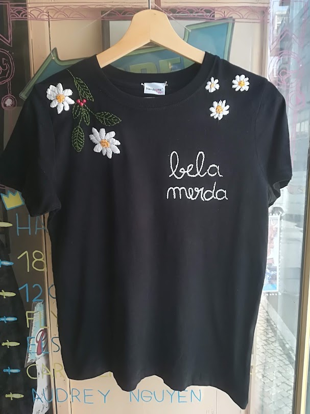 T shirt bordada à mão BELA MERDA c/ Flores